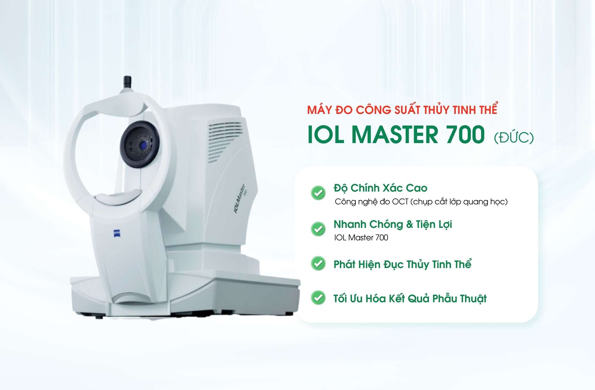 IOLMaster 700 được xem là thiết bị tiêu chuẩn cao trong đo sinh trắc học nhãn cầu hiện nay. Với công nghệ tiên tiến từ Đức, máy giúp nâng cao độ chính xác trong điều trị, góp phần mang lại kết quả thị lực tối ưu và sự an tâm cho người bệnh.